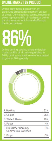 Забавно, что ежегодный отчет GVC Holdings занимает 190 страниц, однако слово «poker» встречается лишь 8 раз. Более того, вот как выглядит распределение доходов GVC Holdings от онлайн-гемблинга в 2019 году по различным сферам (покер и бинго приблизительно одинаково не интересны компании).