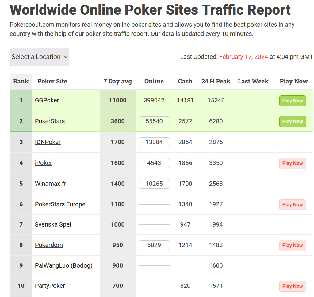 Сейчас на нём можно найти рейтинг румов по количеству игроков в онлайне в данный момент, сколько из них играют кеш, какой пик за 24 часа и среднее число за 7 дней.