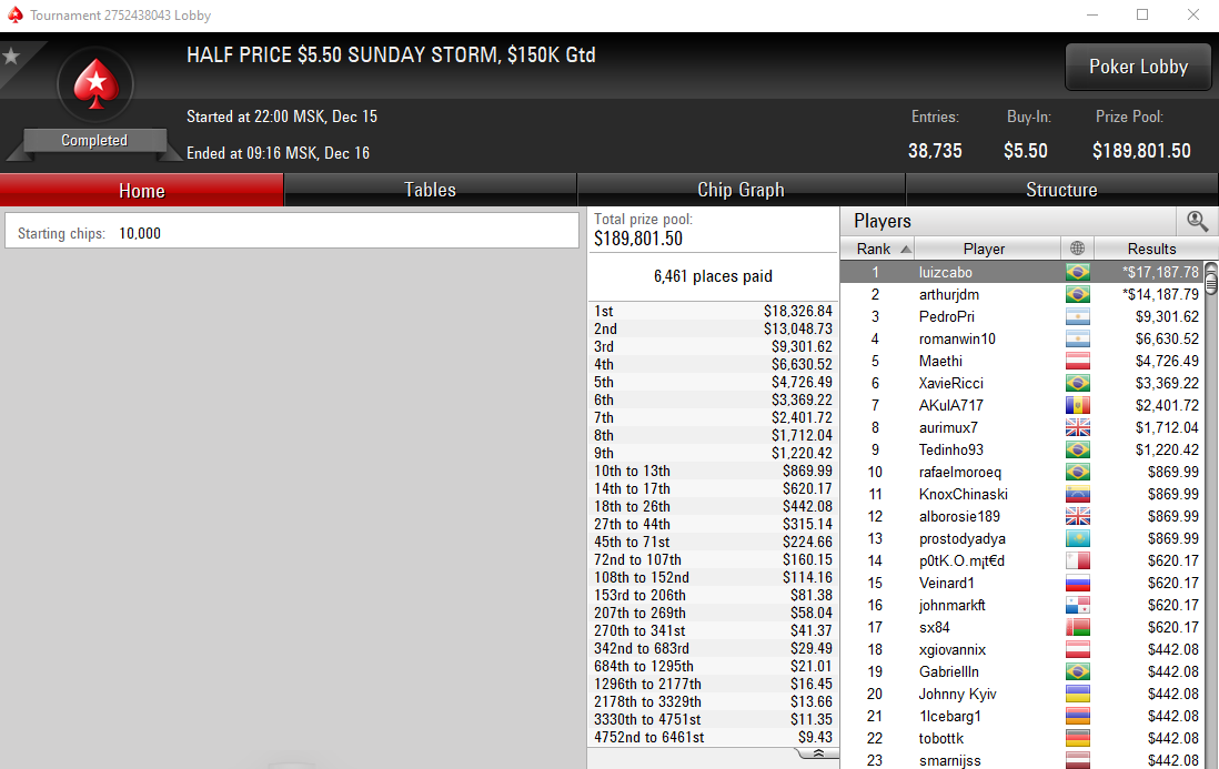 Чтобы собрать стандартную гарантию в не менее культовом Sunday Storm, Старзам требовалось как минимум 30,000 входов и с этой задачей рум также справился. В Шторм по скидке $5,50 запрыгнуло 38,735 участников, что сформировало призовой фонд $189,801.