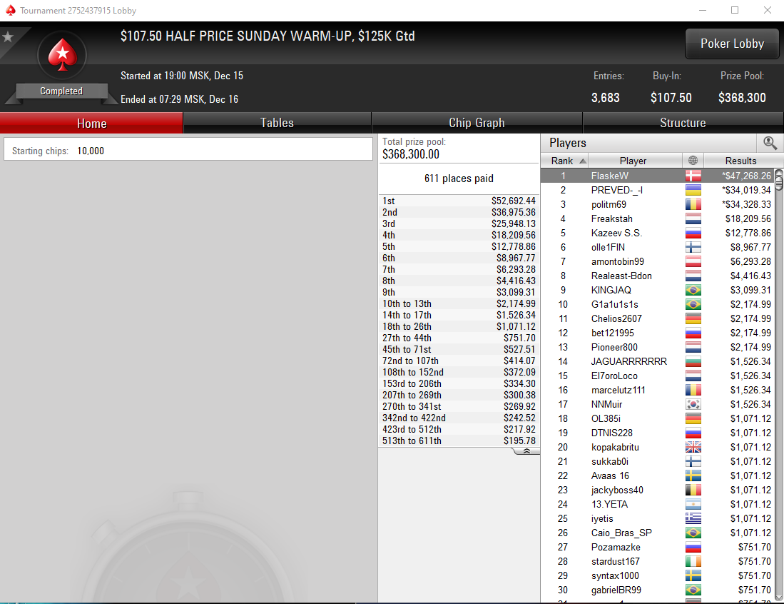 Не менее успешно в воскресенье прошёл Sunday Warm-Up, стоимость которого составила $107,50 — местная гарантия $125K была побита почти в три раза, что может навести PokerStars на мысли о сниженном бай-ине на постоянной основе.