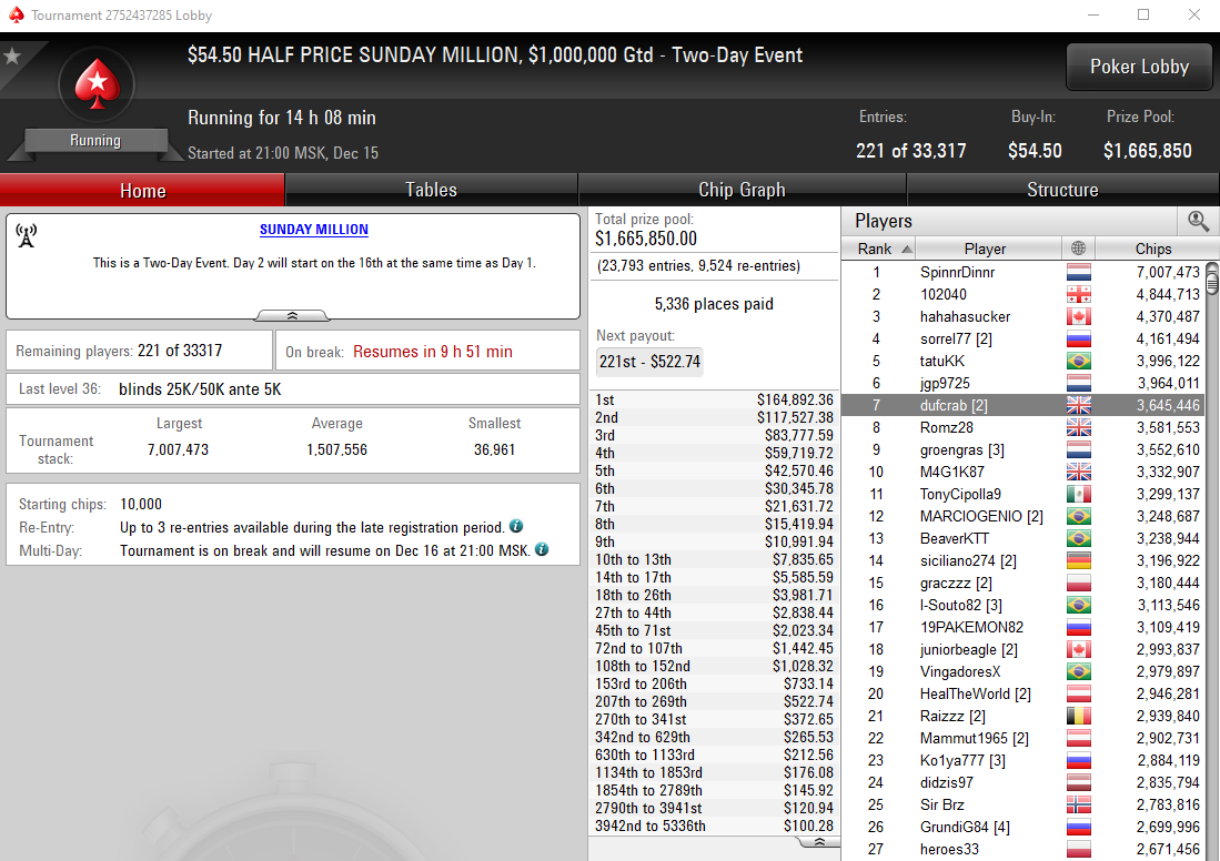 На момент публикации материала турнир приостановлен в стадии топ-221. До существенных пятизначных призов игроки пока не дошли, борьба продолжится сегодня вечером. В топе чипкаунта с 4,5 средними стеками идёт регуляр из Нидерландов под ником SpinnrDinnr. Также на 4 позиции расположился россиянин sorrel77, у которого есть отличный шанс побороться за первый приз $164K+.