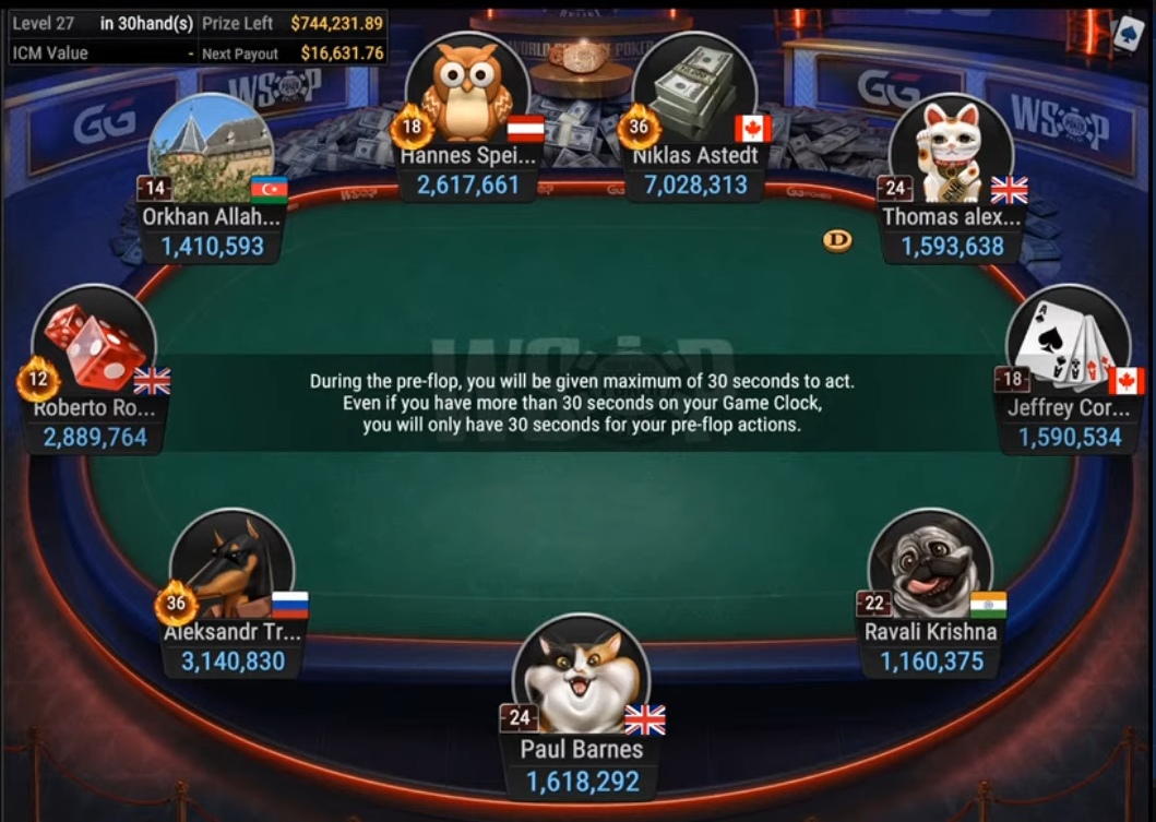 Финалка 39-го ивента WSOP Online 2020 собрала людей из разных уголков мира. За столом встретились британцы Роберто «WelshWizard» Романелло и Пол Барнс, швед Никлас «Lena900» Астедт, россиянин Александр «Black88» Трофимов, француз Томас Александре Казайоус, канадец Джеффри Кормье, австриец Ханнес Шпайзер, индус Равали Кришна и азербайджанец Орхан Аллахвердиев.