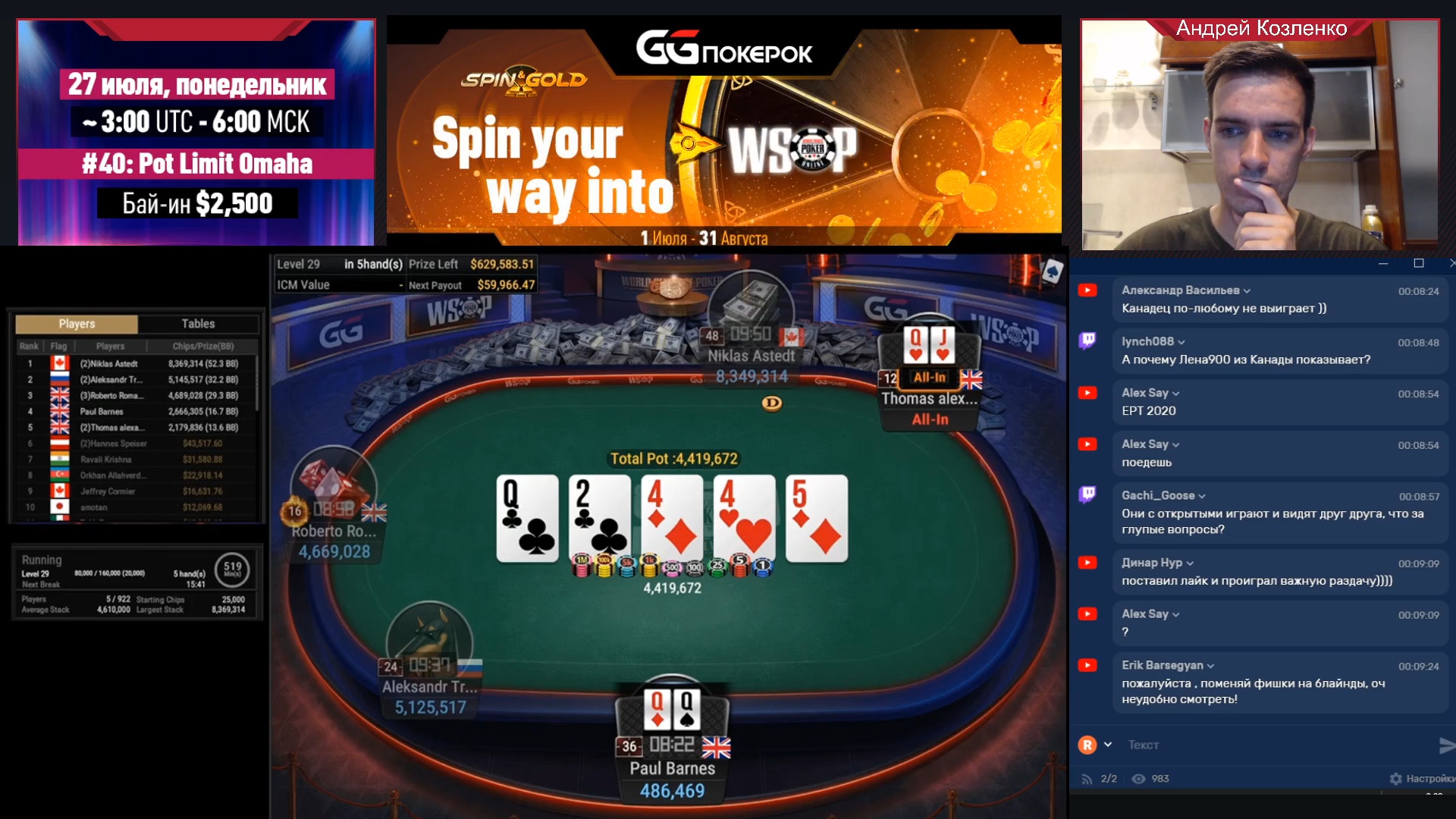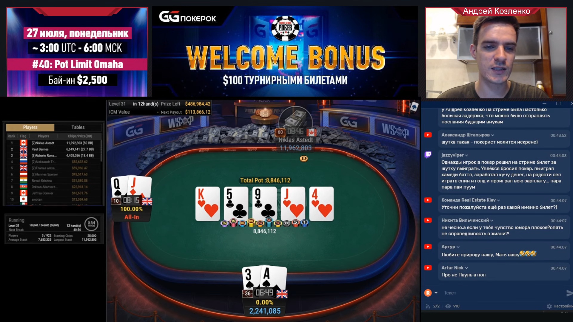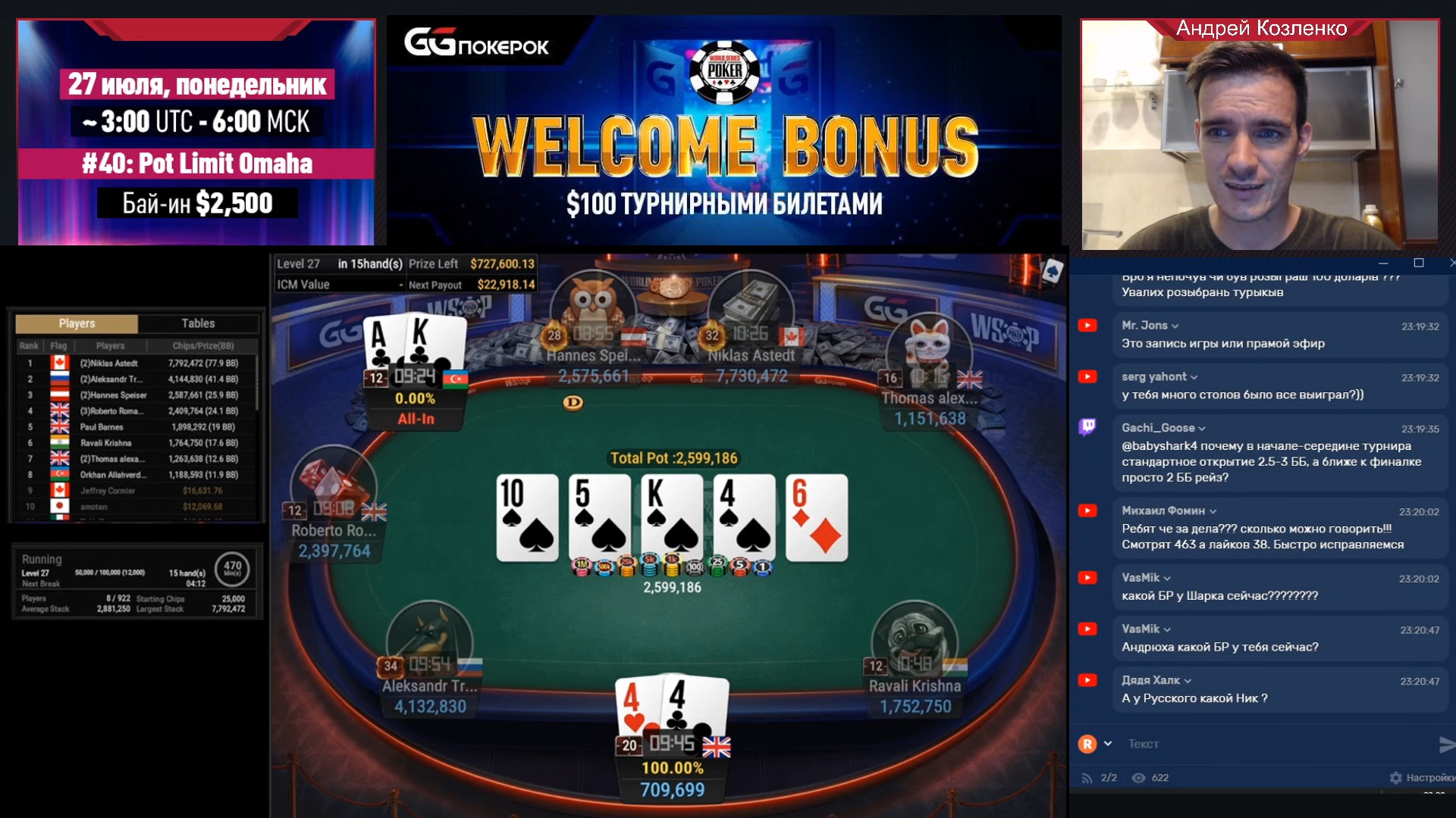Игра за финальным столом транслировалась на канале стримера GGПОКЕРОК Андрея «babyshark4» Козленко, он же выступал в качестве комментатора.