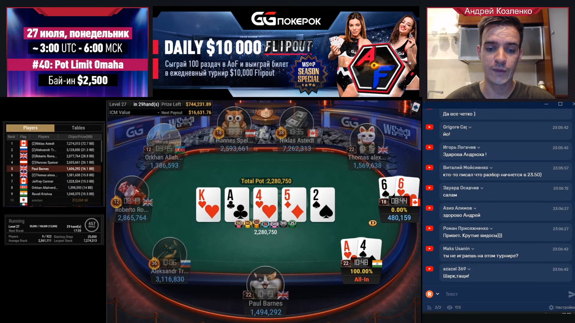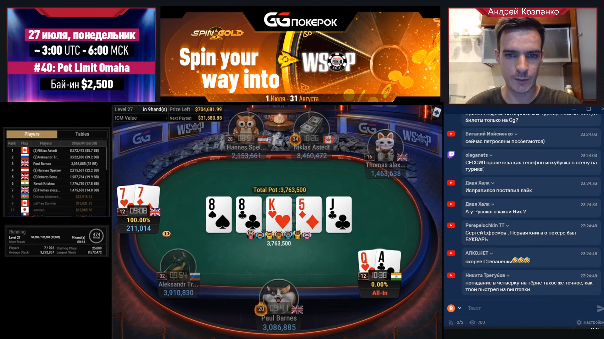 Вслед за ним в коин-флипе встретились Ханнес Шпайзер с KQo и Александр Трофимов с TT. Несмотря на то, что россиянин за финалкой показывал крайне осторожную игру с довольно узким диапазоном, его минрейз из УТГ не насторожил австрийца — тот пошел олл-ин и покинул турнир с выигрышем $43.5K.