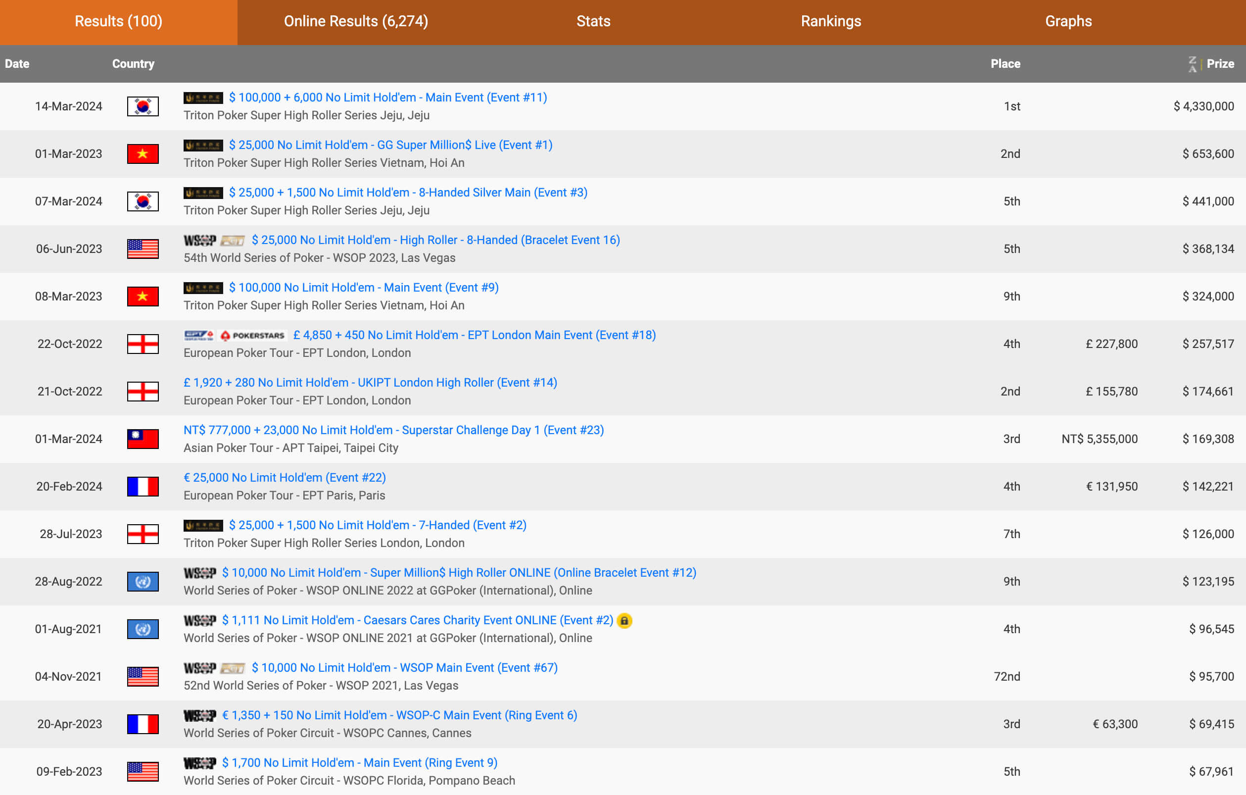 В марте 2024 года он оформил бест-кеш $4,3M за победу в $100K Triton Jeju Main Event.