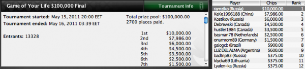 Россияне продолжают выигрывать на PokerStars, после того как поля потеряли американцев. Очередной фриролл Game of Your Life выиграл игрок из нашей страны, на этот раз победителем стал "ramziko". За первое место он получил $10,000 (неплохо для фриролла?) и путевку в Гранд Финал Game of Your Life, победитель которого получит путевку на любое спортивное событие в мире, стоимостью в $100,000.
