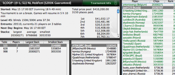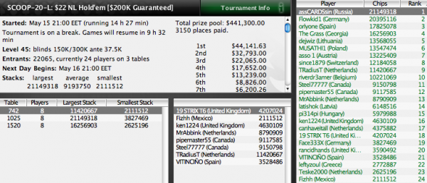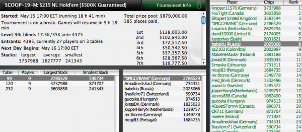 В среднем турнире девятнадцатого события осталось 27 игроков из 4,395 зарегистрированных. Главный приз составляет $138,003 и сегодня за него смогут побороться россияне "babeklu" и "tm1TONY1ps", завершившие первый день на 8 и 27 местах. Хочется отметить, что 4 место в этом турнире занимает "0PIGGYBANK", уже успевший побывать чип-лидером после первого дня старшего турнира SCOOP-02-H с бай-ином в $2,100, но в итоге заняв 10 место.