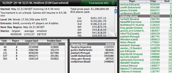 В среднем турнире двадцатого события осталось 47 игроков из 6,449 зарегистрированных. Главный приз составляет $201,727 и на него могут претендовать 3 россиян, а так же игрок из Украины. После окончания первого игрового дня, россиянин "tolstickry" идет на пятом месте, а соотечественники "OMGchips" и "lubop_gem" занимают 27 и 47 места. Украинец "kyu1301" остановился на 19 месте, а так же, в игре остался игрок из Латвии "APonakov", занимающий 13 место.
