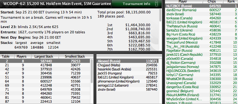 В главном турнире PokerStars WCOOP зарегистрировалось 1,627 игроков, что при бай-ине $5,200 позволило сформировать фантастический призовой фонд в $8,135,000 из которых $1,464,300 достанутся победителю.