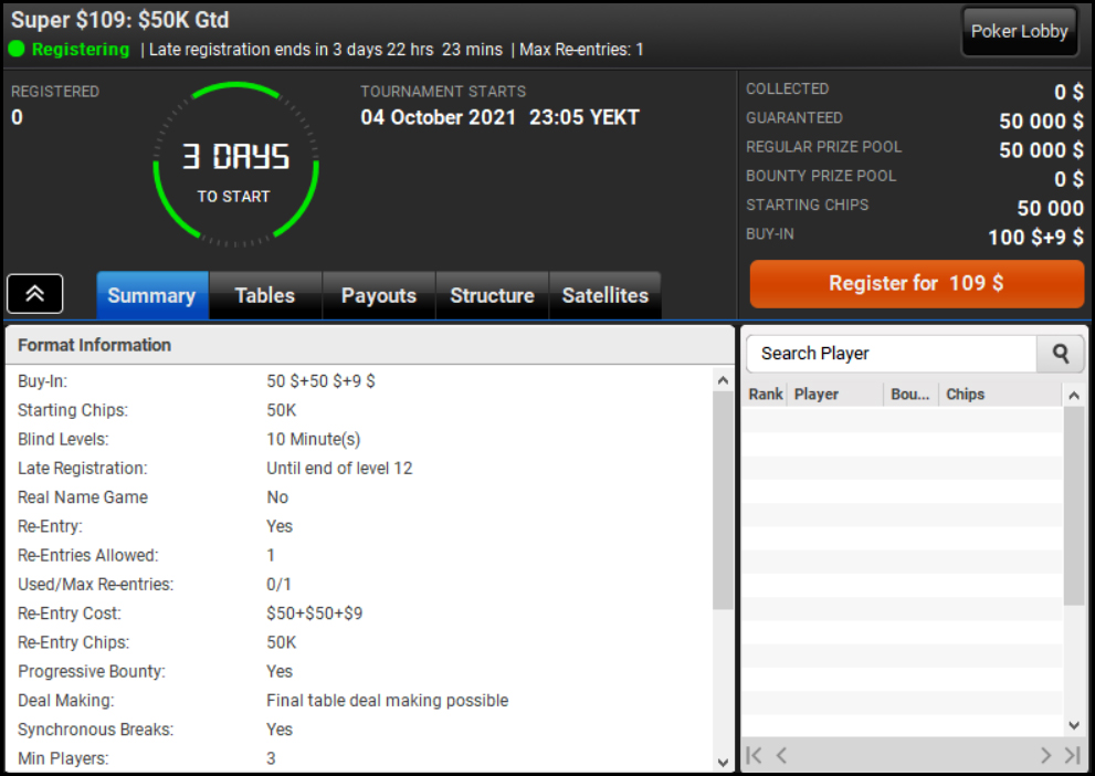 | 21:05 | $109 Super $100K Gtd | $11 Super $25K Gtd | $1.10 Super $1,5K Gtd |