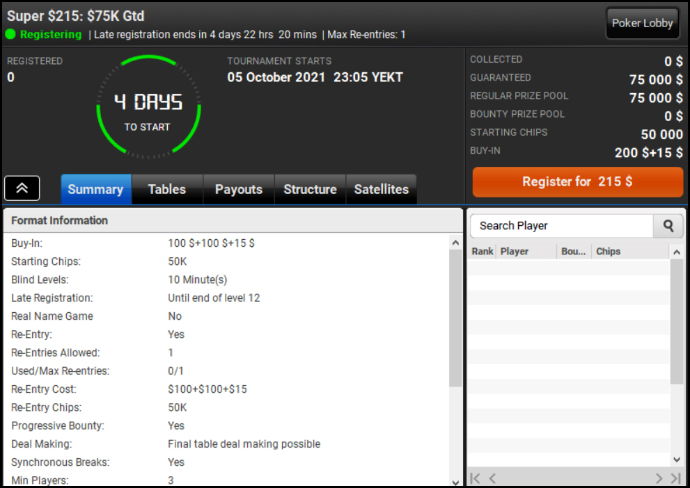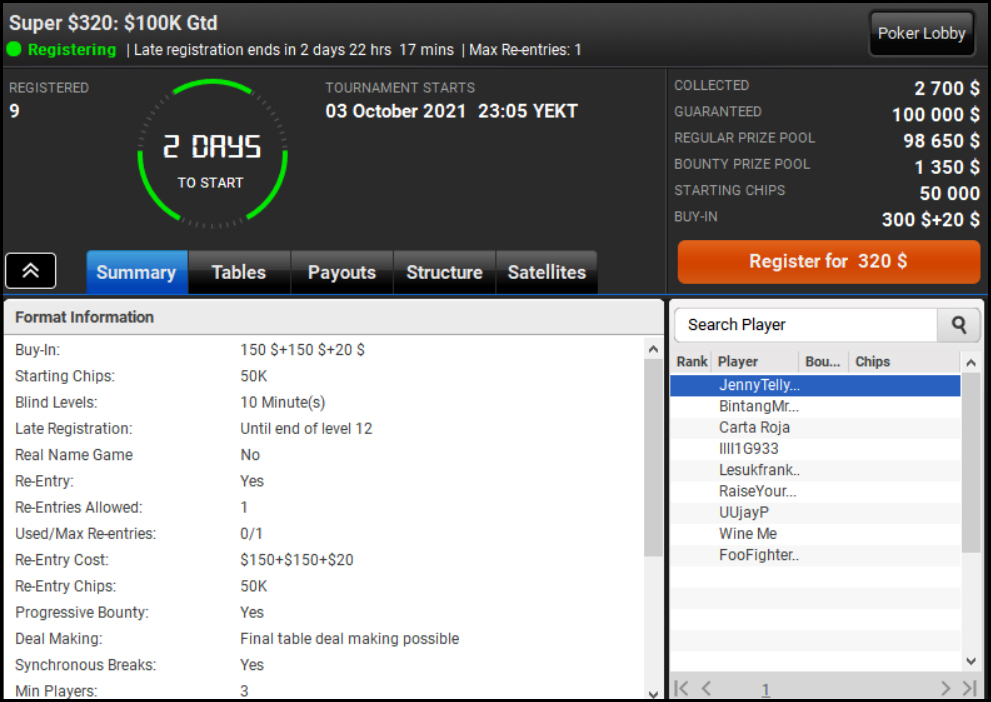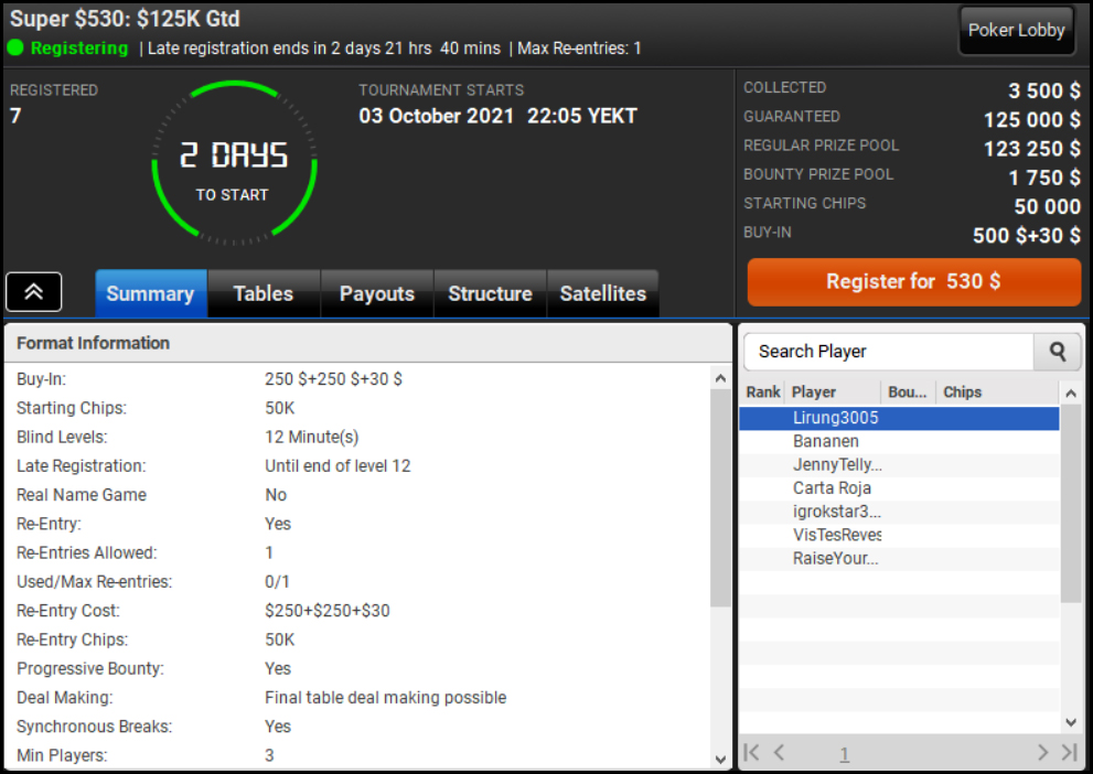 26 сентября расписание Daily Legends пополнилось нокаут-турнирами по NLH с лаконичным названием «Super». С понедельника по четверг они стартуют по три — главный турнир, его мини-версия и микро-версия — в 21:05 МСК: