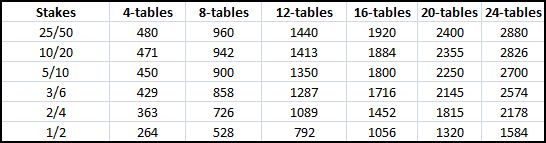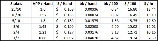 Также обратите внимание, что все эти цифры приблизительны. Также я не стал включать лимиты ниже $1/2, так как в моей базе просто нет достаточного количества рук с этого лимита для точной оценки.