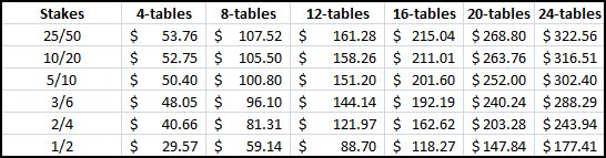 В качестве помощи со своей стороны я составил несколько таблиц, в которых представлен размер VPP в зависимости от лимитов PLO от $1/2 до $25/50 в долларах и больших блайндах. Во второй таблице показано, сколько VPP вы можете получить в час, играя Х столов на лимите Y. В третьей таблице показан доллар в час при игре за Х столами на лимите Y (имея статус SNE). Для примерной оценки я использовал 75 рук в час, но в действительности это количество может варьироваться. Также я принял $0.105 в качестве стоимости каждого VPP, эту цифру я получил, разделив $105,000 на 1,000,000.