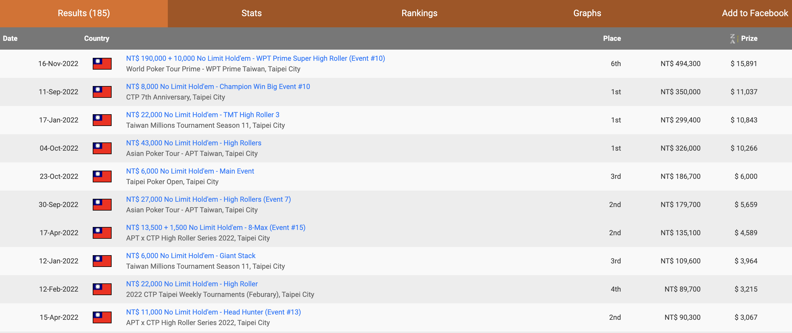 Ву Чиайун может легко поспорить с тем, что офлайн разнообразнее онлайна. Практически раз в два дня он попадал в деньги в одном и том же покерном клубе Chinese Texas Hold’em Poker Club в Тайбэе турнирах по $100 и $200. Лучшие результаты на скриншоте.