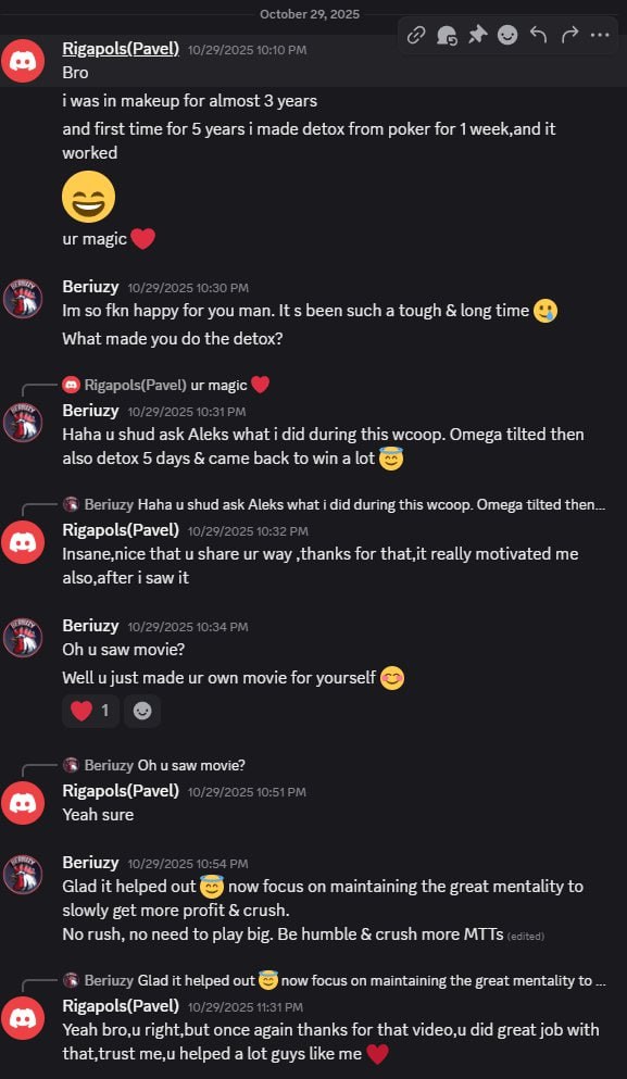 Среди тех, на кого в 2025 смог повлиять Beriuzy, оказался и Павел «Rigapols81» Спирин: он увидел фильм, находясь в замазке почти 3 года, взял после его просмотра перерыв от покера на неделю — чего не делал последние 5 лет! — а вернувшись затащил $2,650 Venom PKO на PokerKing, получив $675,224 и решив все свои финансовые проблемы на тот момент.