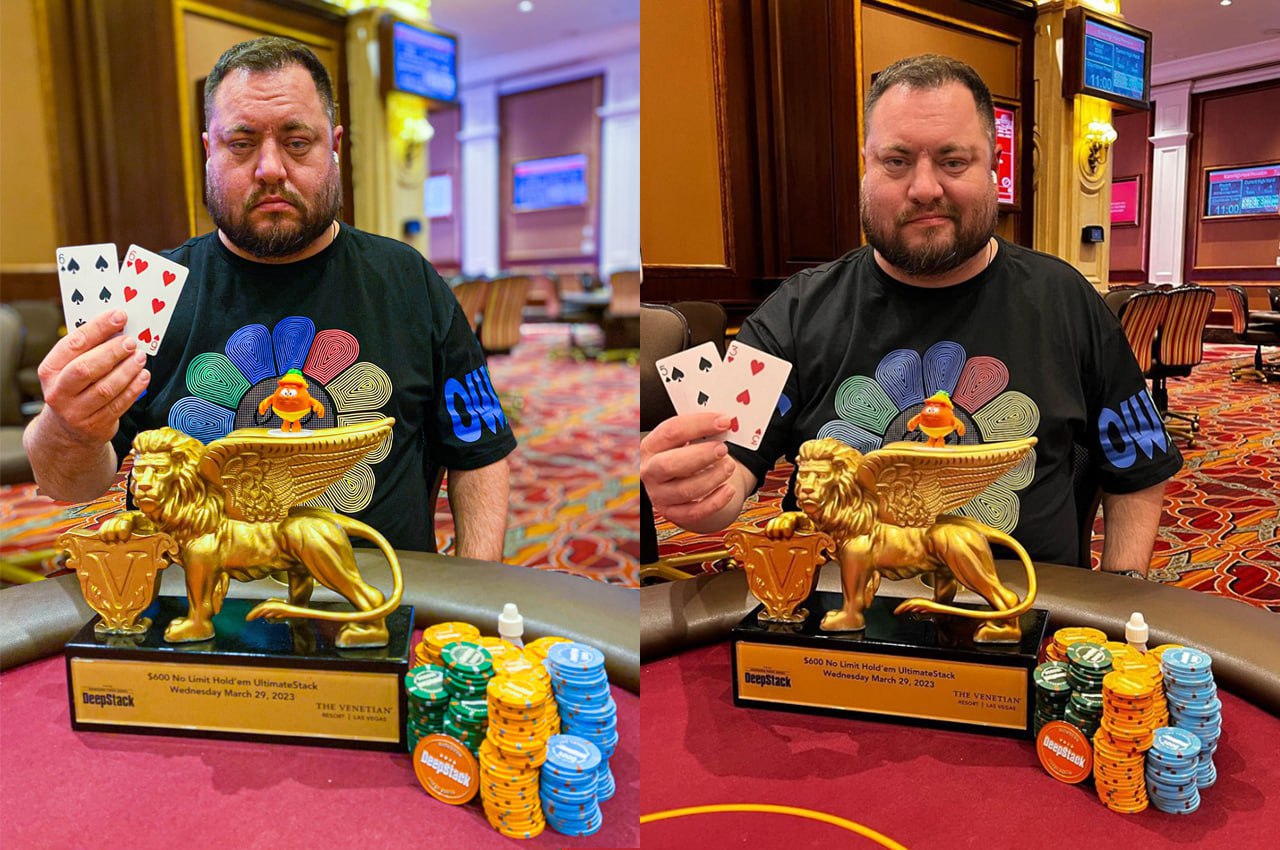 На фото он встречает победу в $600 NLH UltimateStack на DeepStack Showdown 2023 и получение $31K.