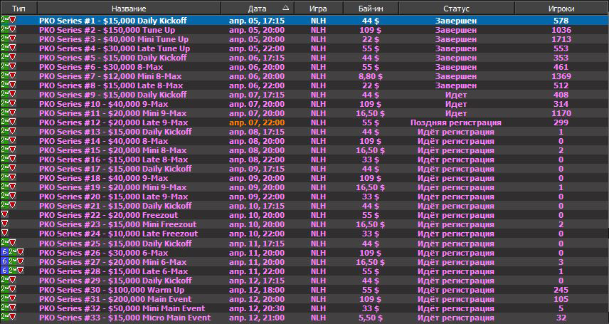 Рум, следующий своей собственной, только ему известной дорогой, это 888poker. Здесь в апреле проходит серия с турнирами в формате прогрессив-нокаут. В феврале, когда румы проводили нокаут-серии, 888poker проводили Blizzard. Сейчас, когда топовые румы проводят серии с акцентом на дорогие турниры, в лобби 888poker проходит PKO Series с самым дорогим турниром за $109. Рум не изменяет традиции: всю турнирную сетку серии реально загрузить многим. В расписании 33 события на общую сумму загрузки в $1608,8 (без учета повторных входов).