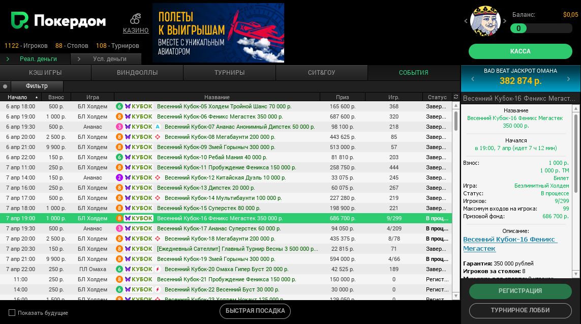 С 6 по 26 апреля на Покердоме проходит Весенний Кубок. Покердом — ещё один спорный рум, когда речь заходит о трафике. Анализ кэш-столов показал, что дорогой игры на деньги здесь нет. Но только взгляните на турнирное лобби. За 2 дня серии в большинстве турниров гарантия оказалась покрыта в 2-3 раза.