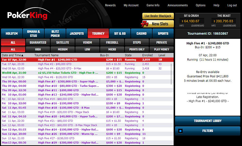 Подход к организации турниров и серий в румах Азии, Европы и США отличаются. В американском руме PokerKing 7 апреля стартовала серия High Five. В расписании 100 турниров (без делений в зависимости от размера бай-ина на S, M, L, XL). Основной акцент смещён на события с бай-инами от $100 до $5.000 (таких турниров 34).