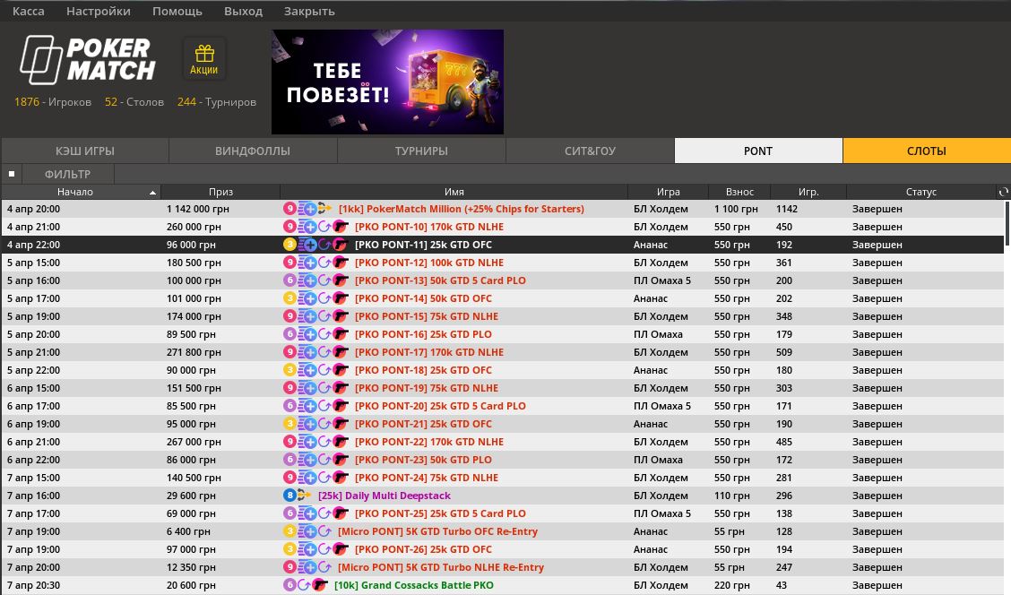 Оригинальный принцип, позаимствованный у магазинов FixPrice, в организации турнирного расписания демонстрирует PokerMatch. Здесь проходит PONT и Micro PONT с фиксированными бай-инами в 550 грн. ($20) и 55 грн. ($2) соответственно. В турнирах PONT в отличие от МТТ в других румах не собираются огромные килополяны. Среднее количество регистраций — от 150 до 500. События в формате ре-энтри с 2 часами поздней регистрации. Каждому, зарегистрировавшемуся до начала турнира, +25% фишек к стартовому стеку.