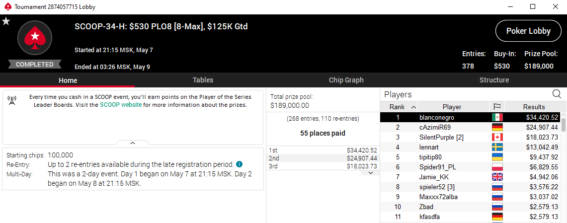 SCOOP-34-H $530 PLO8 [8-Max] — призовые $34,420.