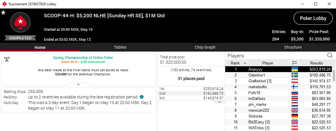 Заметьте, что для победы ему хватило одного входа, в то время как некоторые из его оппонентов заходили за $5200 по несколько раз. Хедз-ап Anjeyyy против шведа Odonkor1 продлился ровно час.