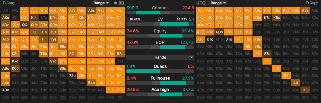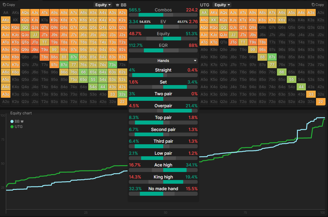 Если проверить эту ситуацию в солвере, чтобы посмотреть эквити и EV каждого игрока, вы увидите, что у UTG преимущество по эквити составляет 51.3%, но он имеет EV 2.26 ББ, тогда как игрок на BB делает 3.34 ББ.