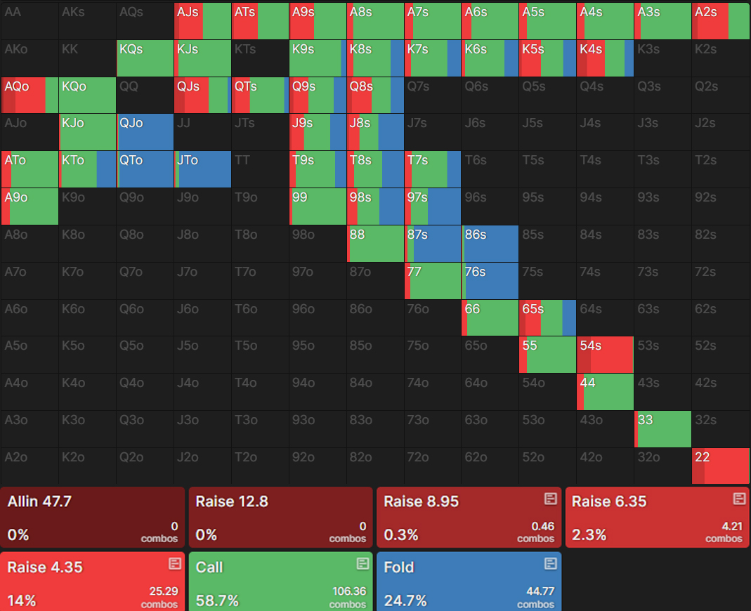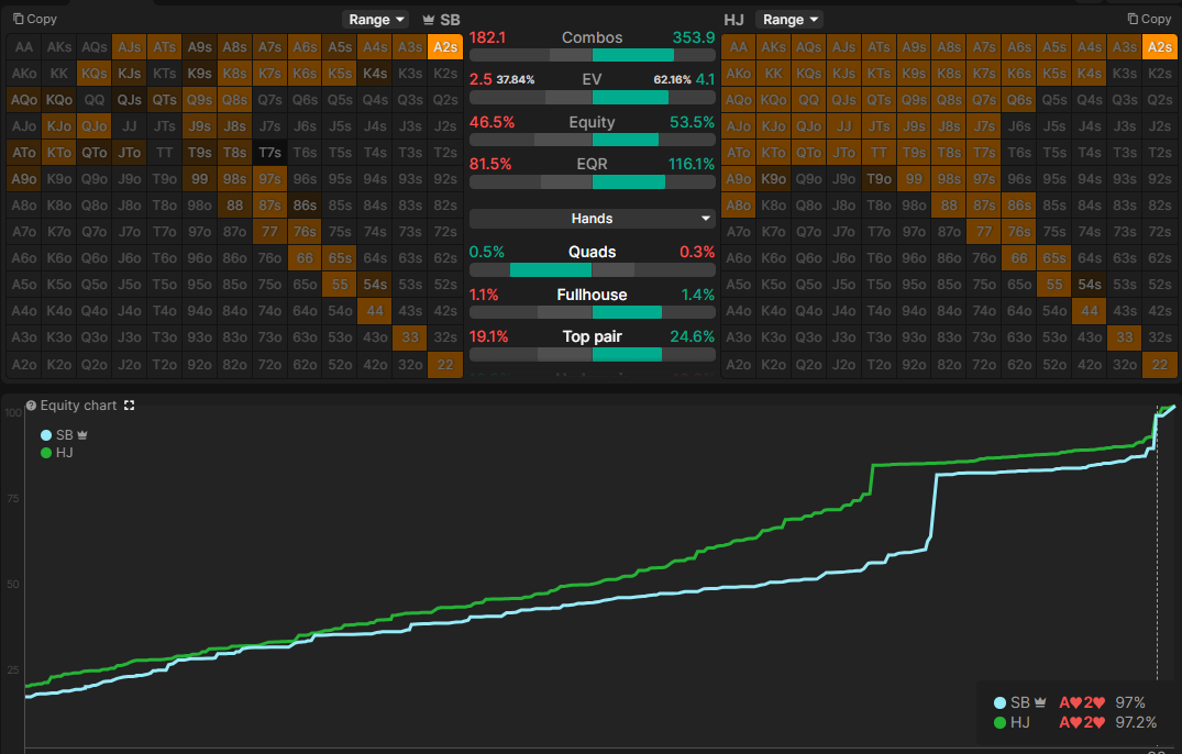 Как вы с SB будете играть в этой ситуации A2s? Многие люди могут сказать, что залидят, ведь у HJ много Ax, которые будут коллировать. Солвер ответит на это, что нужно чекать в 100% случаев. Почему?