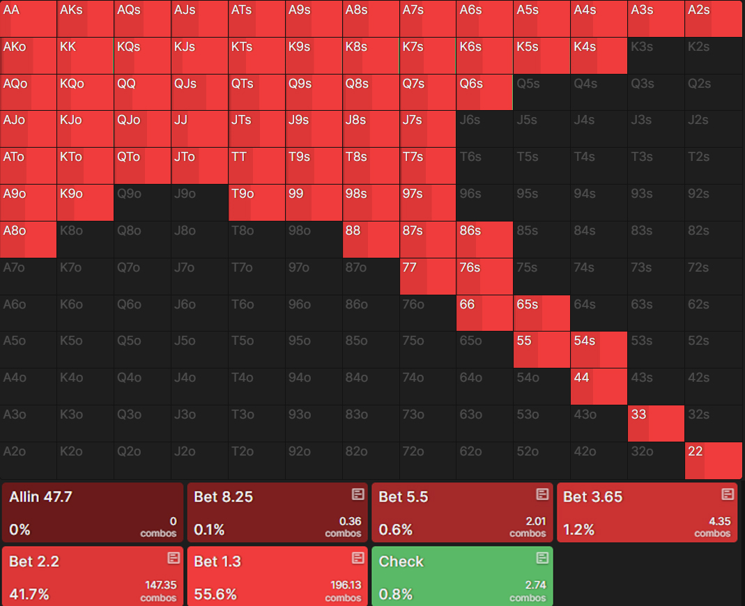 По сути, нас интересует — кто с большей вероятностью будет иметь в раздаче преимущество по диапазону и чей совокупный диапазон сильнее. Также можно задаться дополнительным вопросом: у кого в этой ситуации преимущество по натсам — кто будет иметь лучшие отдельные руки, даже если их совокупный диапазон слабее.