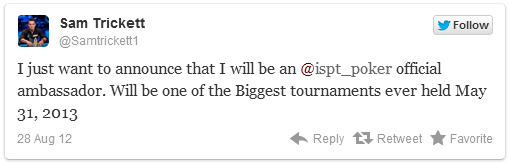 Теперь на одежде Сэма во время различных покерных турниров и мероприятий можно будет разглядеть не только брендовые ярлычки, которые молодой покерист очень любит, но и логотип ISPT, первая остановка которого пройдет на стадионе Уэмбли (Лондон) с 31 мая 2013 года. По заверениям организаторов, они ожидают не менее 30 000 человек и гарантируют призовой фонд в 20 миллионов евро.
