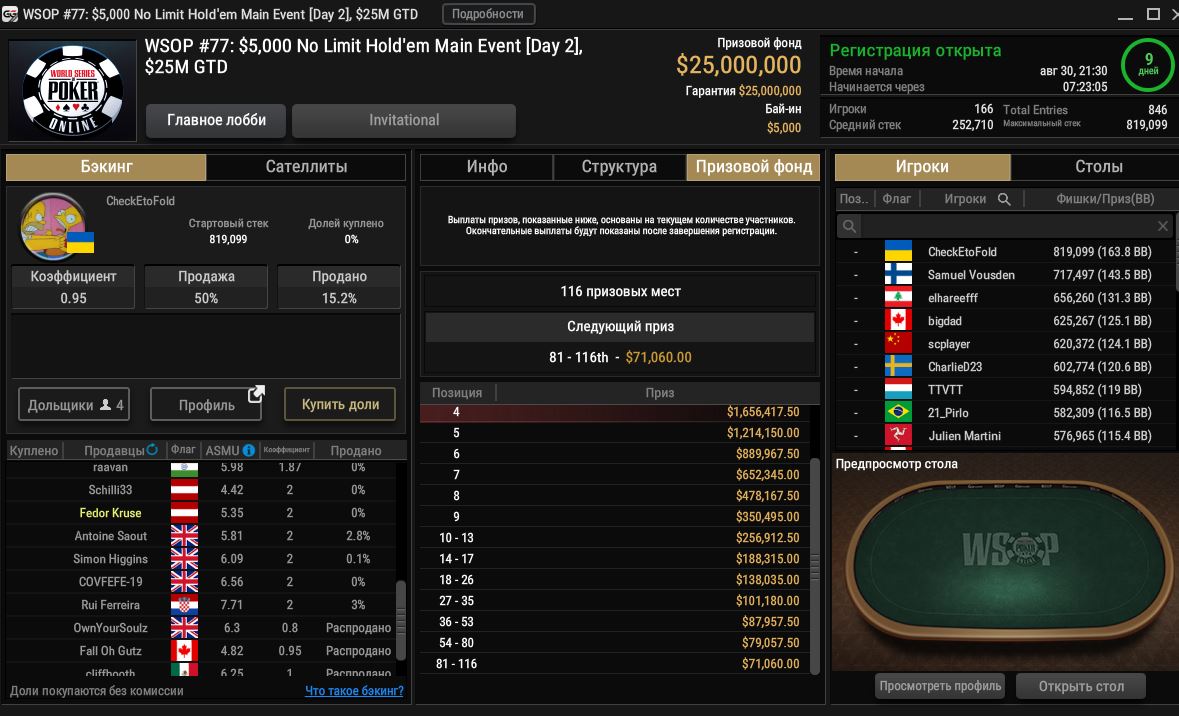 Заработать в Главном событии Мировой серии можно, не участвуя в турнирах. В руме действует биржа долей. Причем можно приобрести дольку у игрока, который уже прошел во второй игровой день. Например, у чиплидера «CheckEtoFold» можно купить 0,1% дольку за $77,85. При текущих выплатах в случае минимального ITM дольщик гарантирует 0,1% выигрыша — $71,06. "CheckEtoFold" продает 50% экшена, причем 15,2% на момент написания статьи уже куплены.