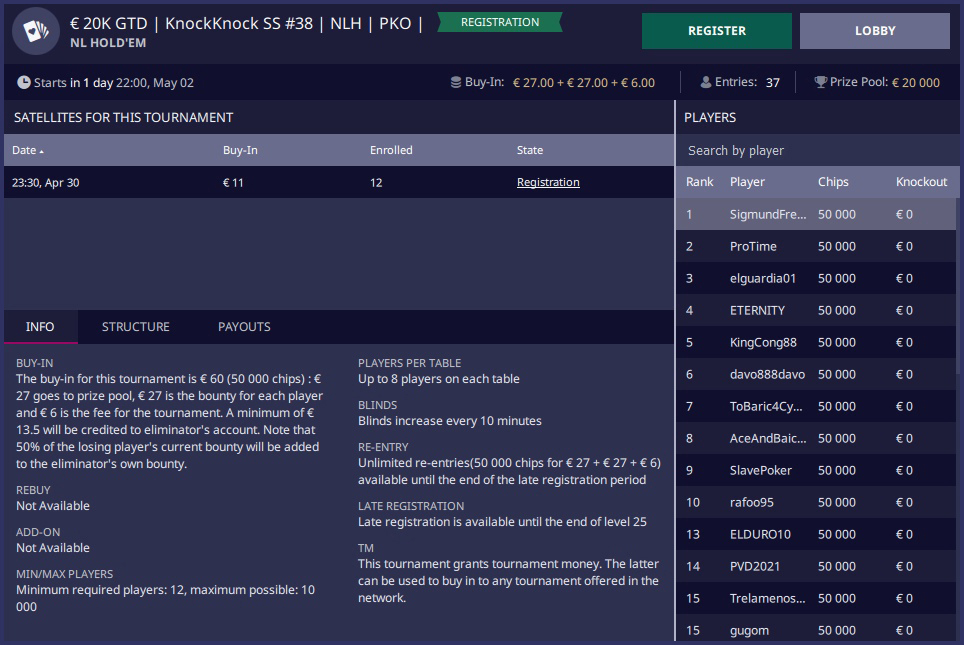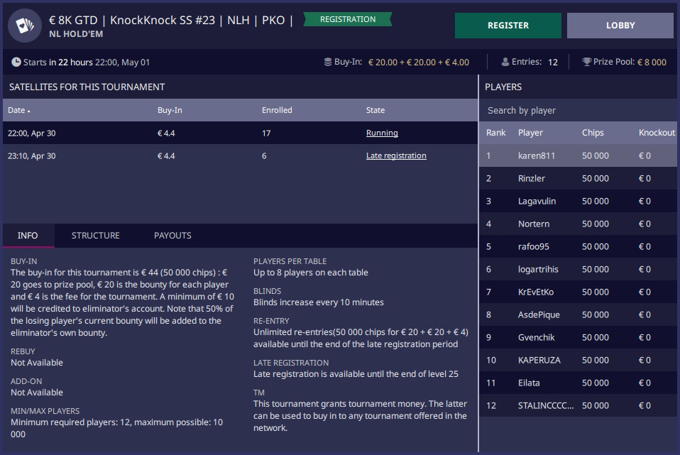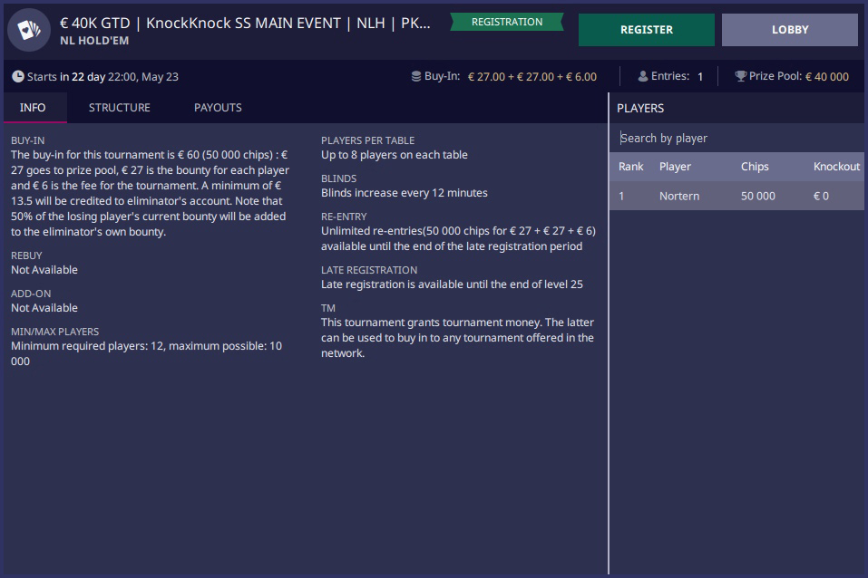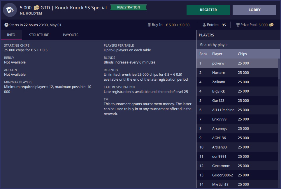 Серия Spring Knock Knock закончится 23 мая — на следующий день ТОП-40 игроков по лидерборду получат призы от €33 до €2,5К турнирными деньгами.