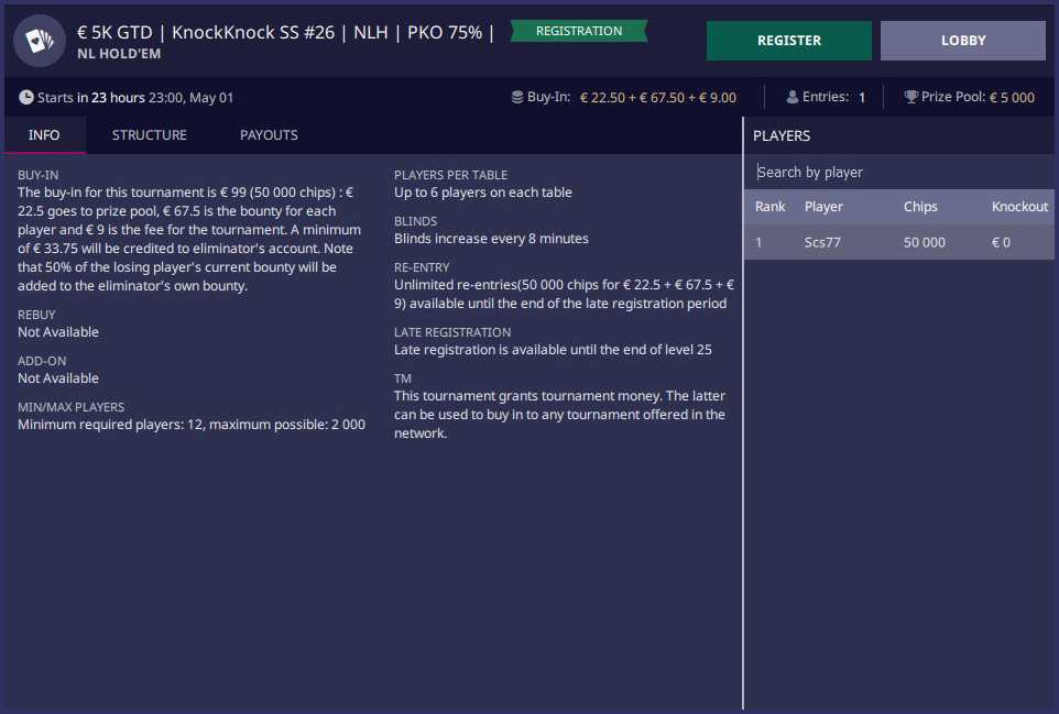 | KnockKnock SS #6 NLH | €22 | €2K | 87 | €260 | €174.44 |