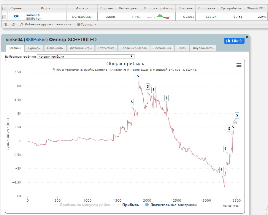 Судя по открытой статистике, sinke34 играет турниры низких лимитов и совсем недавно вышел из даунстрика.