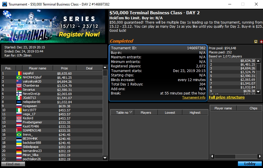 Business Class с бай-ином $25 собрал чуть меньше народу (2072 входа), но также уверенно побил гарантию. Победу праздновал игрок из Румынии под ником sapaRd ($8,635).
