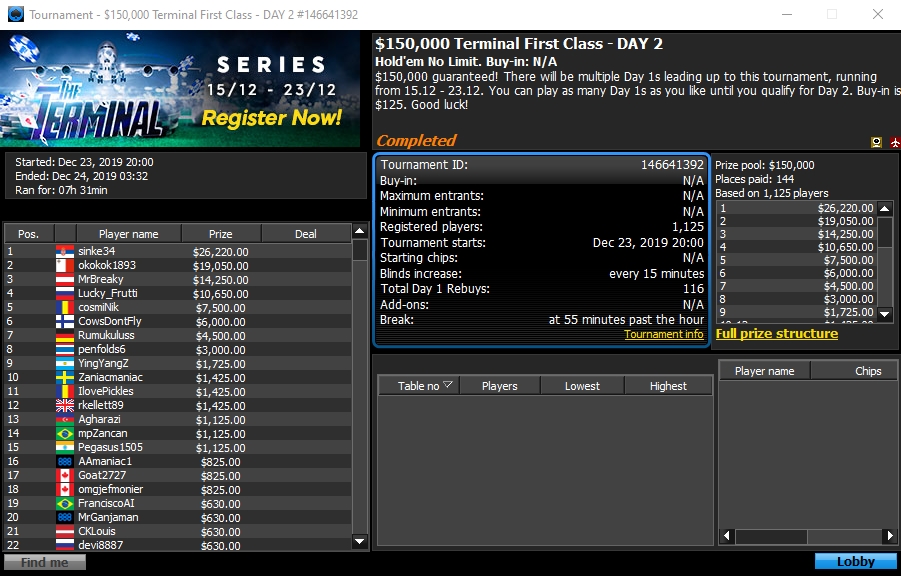 А вот «первым классом» улетело всего 1125 человек, чего не хватило для побития гарантии $150,000. Оверлей составил в районе $21,000, что равняется примерно 10% от общей гарантии серии. Этот турнир дорого обошёлся 888poker, ведь для выплаты полной гарантии рум, получается, отдал почти весь собранный рейк с серии. Главный приз в The Terminal First Class получил игрок из Сербии под ником sinke34 ($26,220).