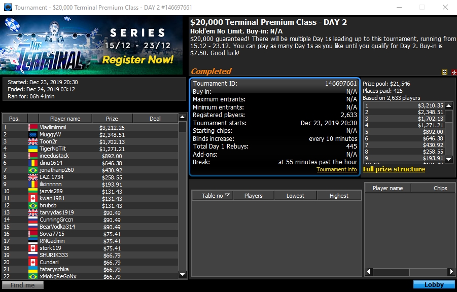 Не сказать, что был аншлаг, но несколько тысяч участников всё-таки набралось. В самой демократичной версии «терминала» Premium победил игрок из Беларуси под ником Vladimirnml ($3,212). Входов набралось 2633 и гарантия $20,000 была с лихвой побита.