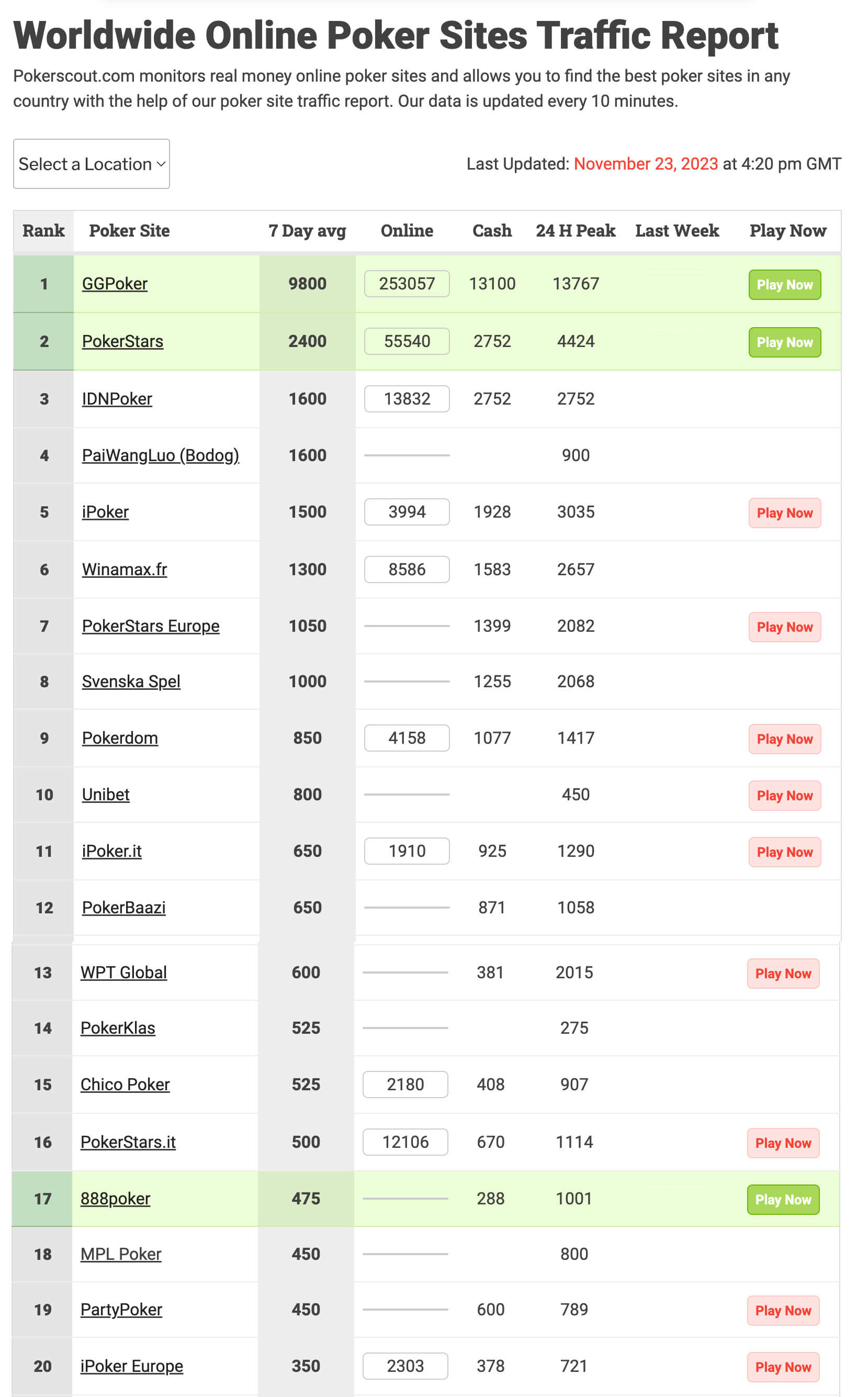 Примечание: PokerScout учитывает количество занятых мест (а не количество уникальных игроков) за кеш-столами.