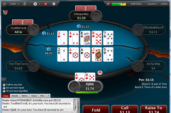 Турниры с двойным бордом — редкость. Но двойной борд можно встретить за столами PLO в мобильных приложениях.