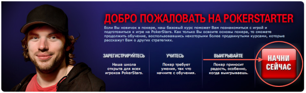 На сайте Школы PokerStarter вас встретит Иван Демидов, а справа вы найдете красную кнопку «начни сейчас».