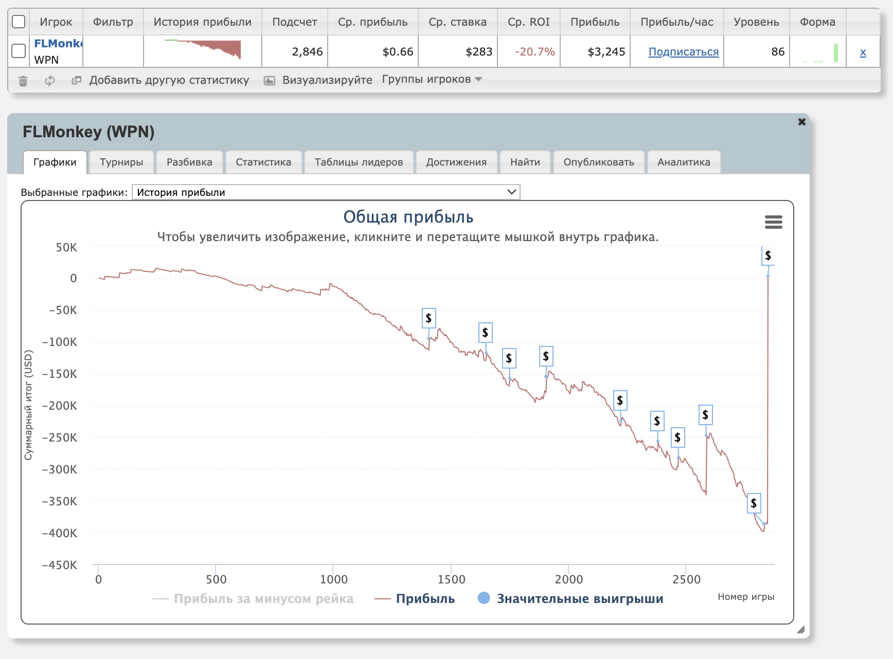 Второе место позволило FLMonkey вывести свой график на SharkScope в плюс. Всего за 6 лет его график опустился до отметки -$398K.