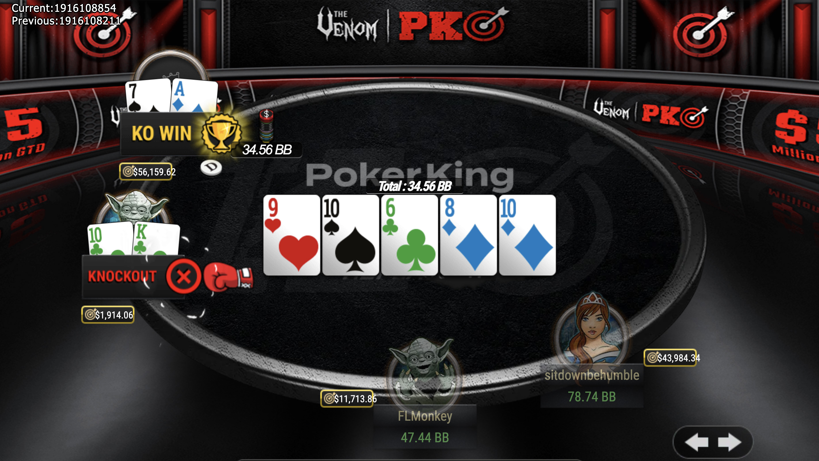 Победителем турнира стал sitdownbehumble ($683,3K). Он играет на PokerKing только крупные события, типа The Venom, и серийники. С 2017 года отыграл 450 турниров в -$66K.