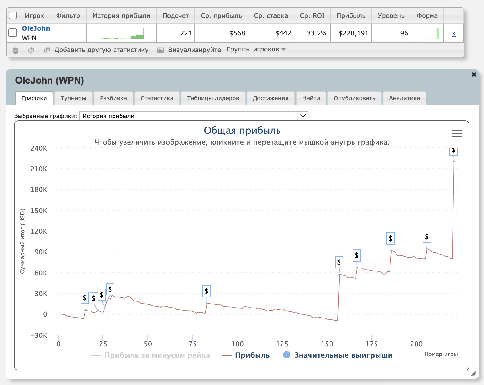 OleJohn c 2021 года сыграл на PokerKing 221 турнир. В октябре 2023 он поймал апстрик и без учёта доезда в Веноме выиграл ещё $80K.
