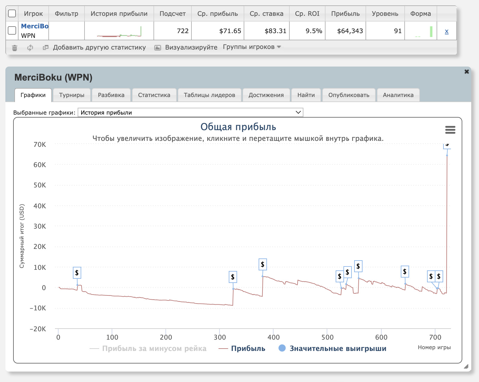 В этот турнир MerciBoku отобрался с сателлита за $290. По данным SharkScope, до Венома график опустился до -$2,8K.