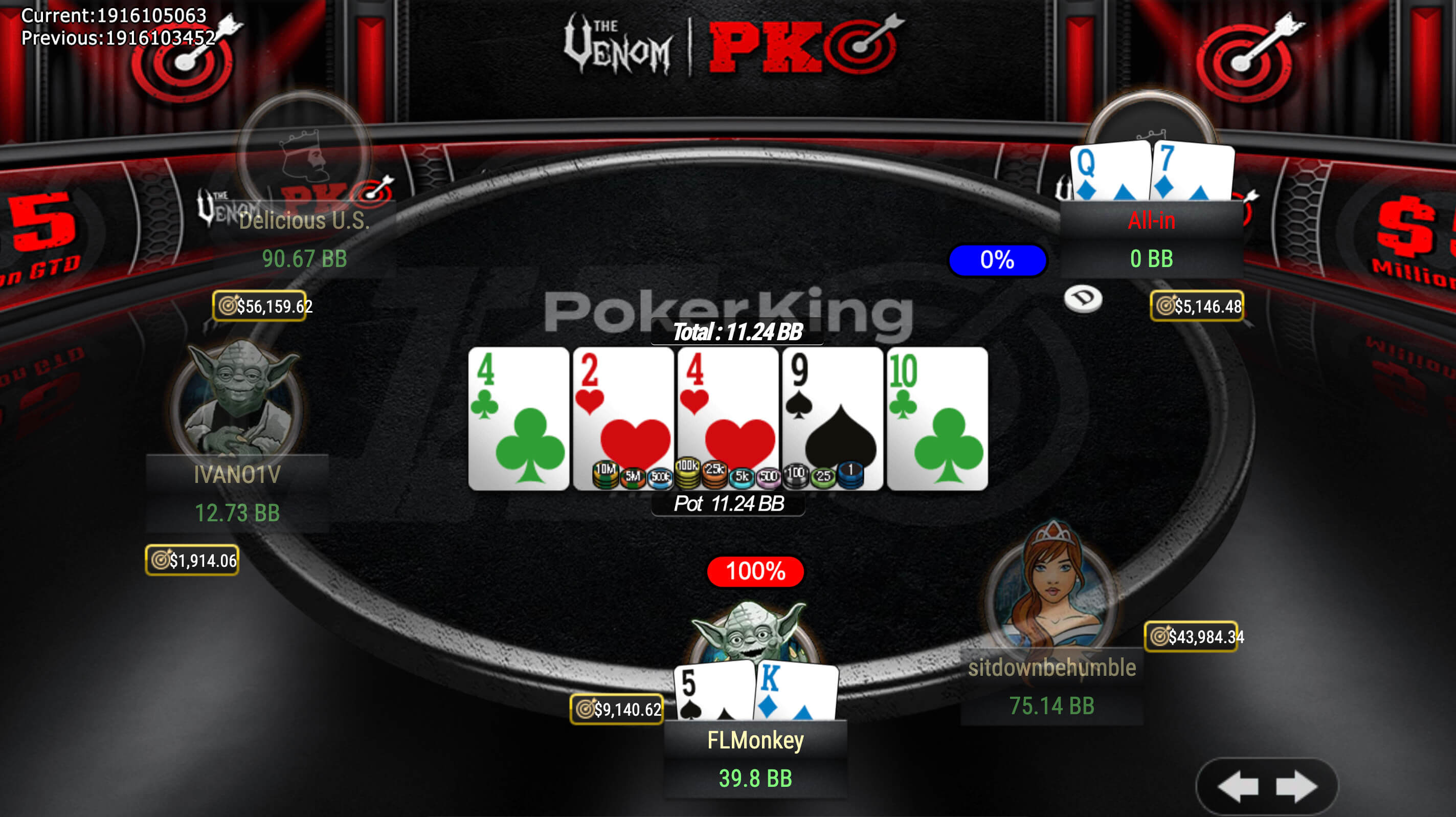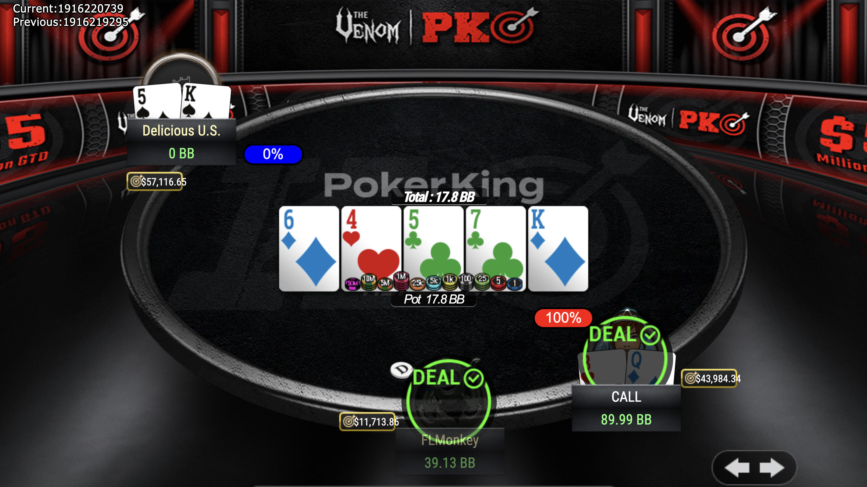 В итоге стек опустился до 5 бб. Устинович поставил олл-ин c BTN с Q7s и получил колл от FLMonkey c К5о.