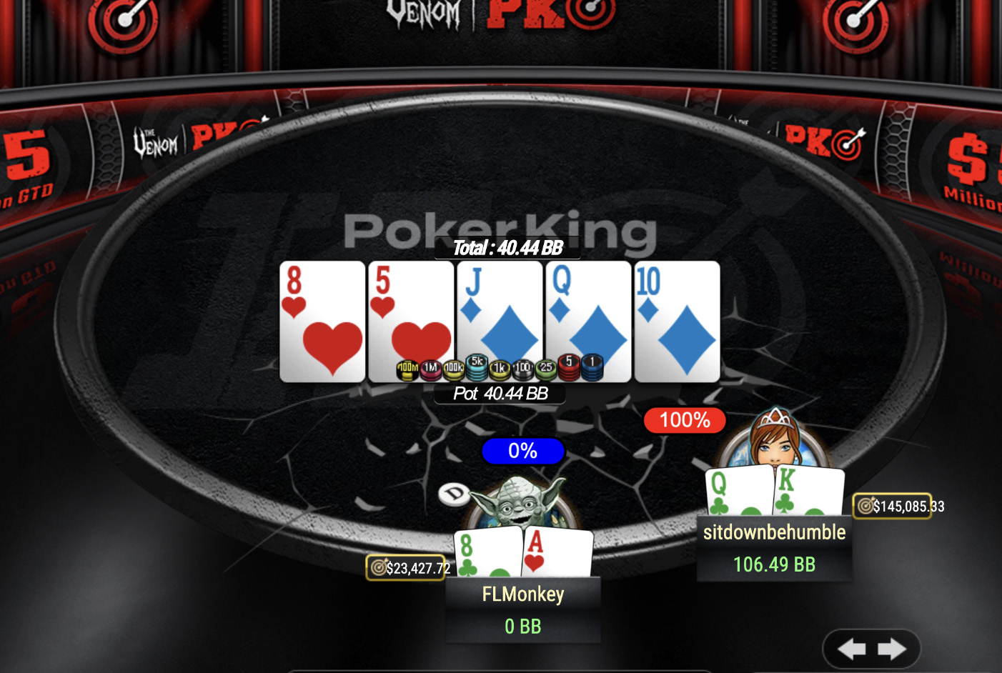 В финальной для себя раздаче он запушил 9 бб с K5s, sitdownbehumble заколлировал с Q8o и собрал стрит.
