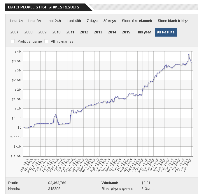 Профессионал Pokerstars, который этим летом чуть не обанкротил «коллегу по цеху» и едва не выиграл 3 браслета за 1 мировую серию, не так грозен на скайлимитах онлайна. За 5 лет он сыграл всего 87 тысяч рук на лимитах 50$/100$ и выше, но проиграть успел больше полумиллиона.
