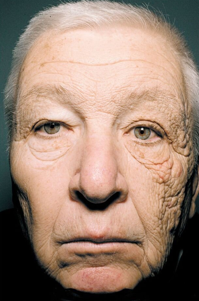 Один из наглядных примеров из сферы науки — фотография 69-летнего дальнобойщика, которую разместил медицинский журнал Новой Англии США. На ней видно, что левая сторона лица мужчины выглядит сильно старше правой из-за того, что на неё регулярно и в избытке попадал солнечный свет.