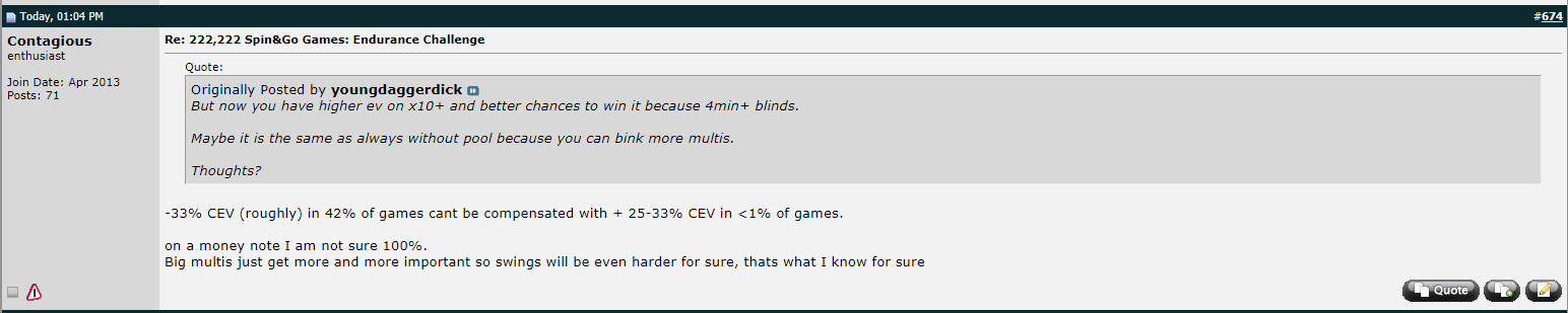 “Но теперь ты имеешь более высокий EV на x10+ и лучшие шансы на выигрыш, потому что блайнды 4 минуты и более. И ты сможешь бить большие множители. Мысли?”Contagious:
