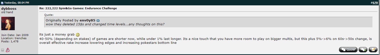 Это просто обдиралово. 40-50% (в зависимости от бай-инов) игр короче теперь, тогда как менее 1% длятся дольше. Это хорошее решение, когда ты имеешь больше пространства для игры при больших множителях, но это плюс 5%->6% на $60->$50, что в целом эффективно увеличивает рейк, понижая преимущество и повышая выгоду PokerStars